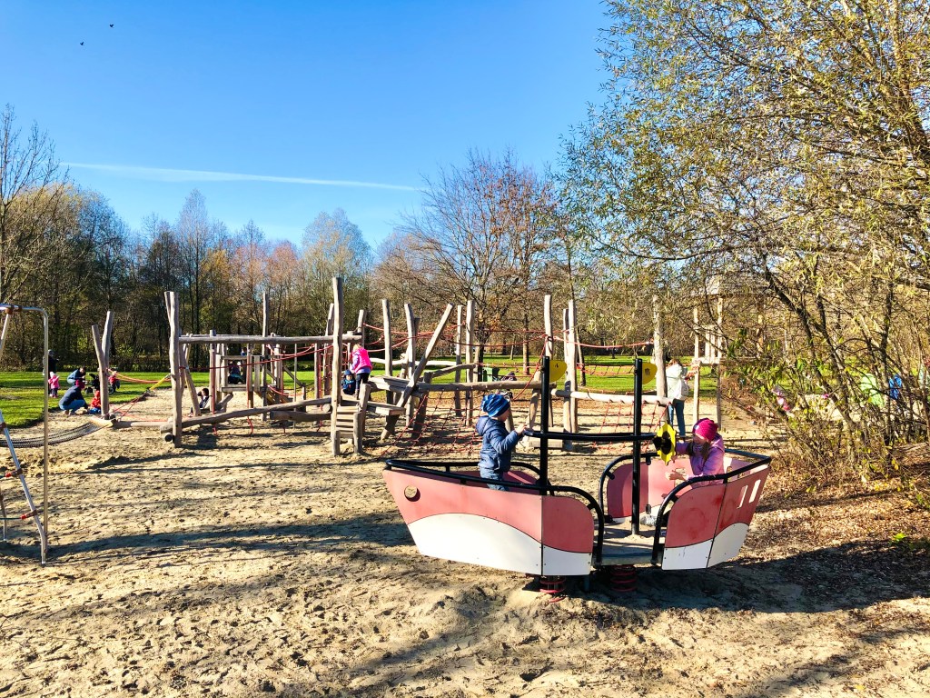 На озере Лусзее (Lußsee) в западном Мюнхене людно и в ноябре. Тут не просто пляж, а большой парк с игровыми, волейбольной и футбольной площадками. Жилых районов поблизости нет, но людей много. Особенно это место любят семьи с детьми. Ну ещё бы, обе игровые площадки и правда отличные!