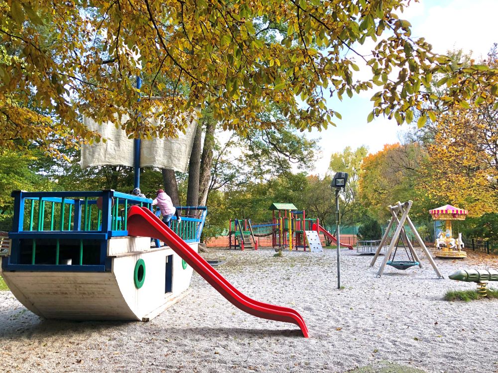 Игровая площадка на Münchner Freiheit оформлена в той же цветовой гамме, что и станция метро под ней. Тут много детей, много места, симпатичные постройки и кафе-кондитерская сразу за ограждением.