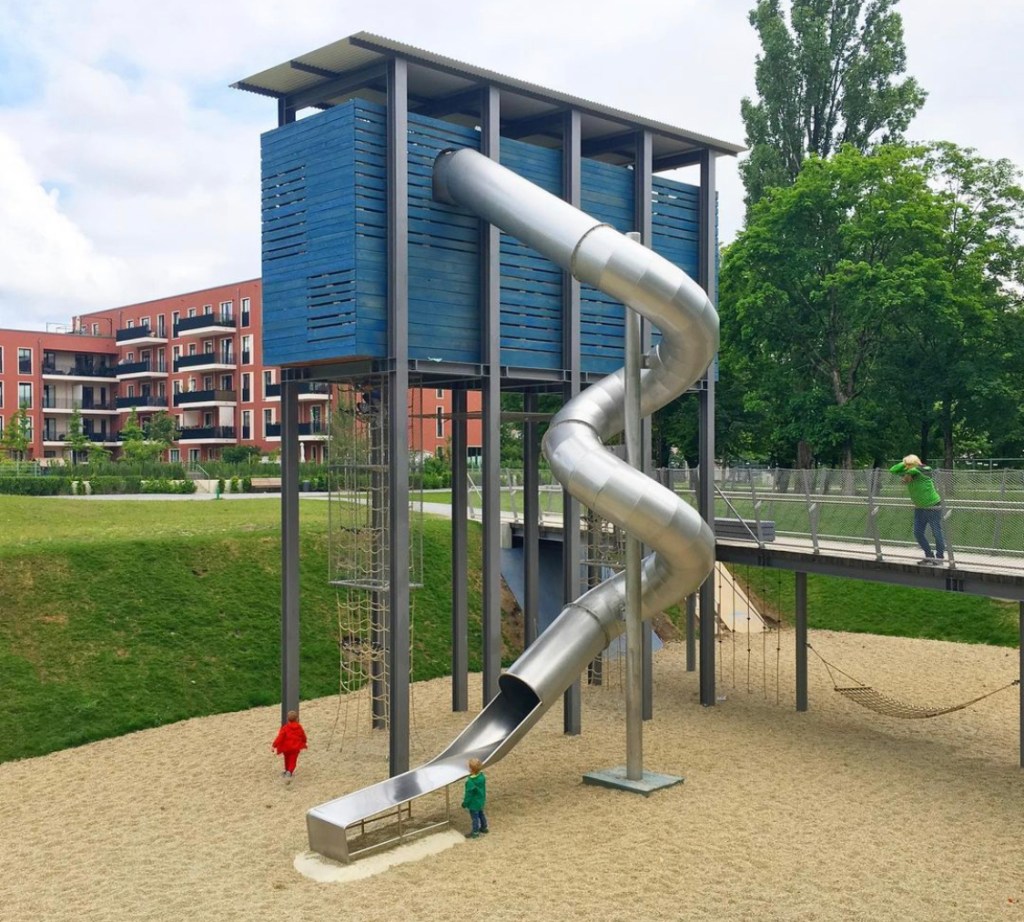 Kiefernwald, то есть «сосновый лес» — это небольшой лесок с молодыми соснами в районе Кифернгартен (Kieferngarten). И в нём эта площадка в виде дома-амбара с горками и сетками.