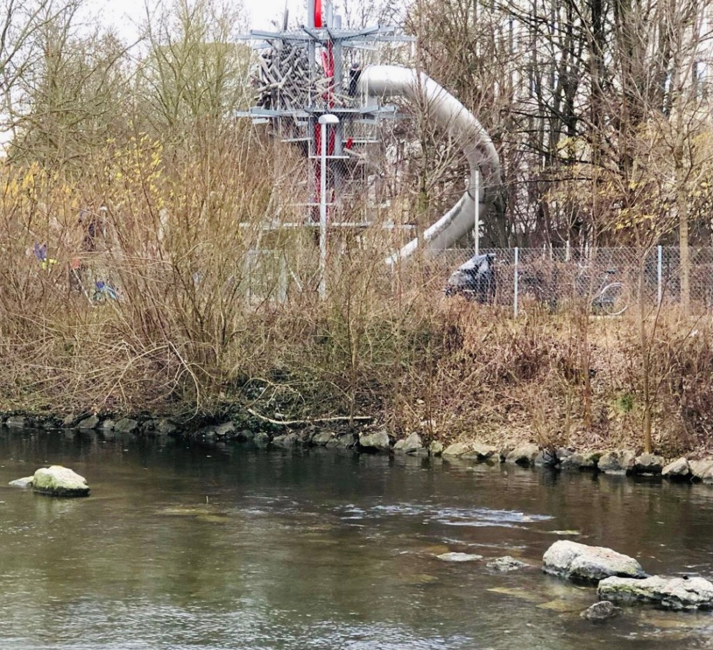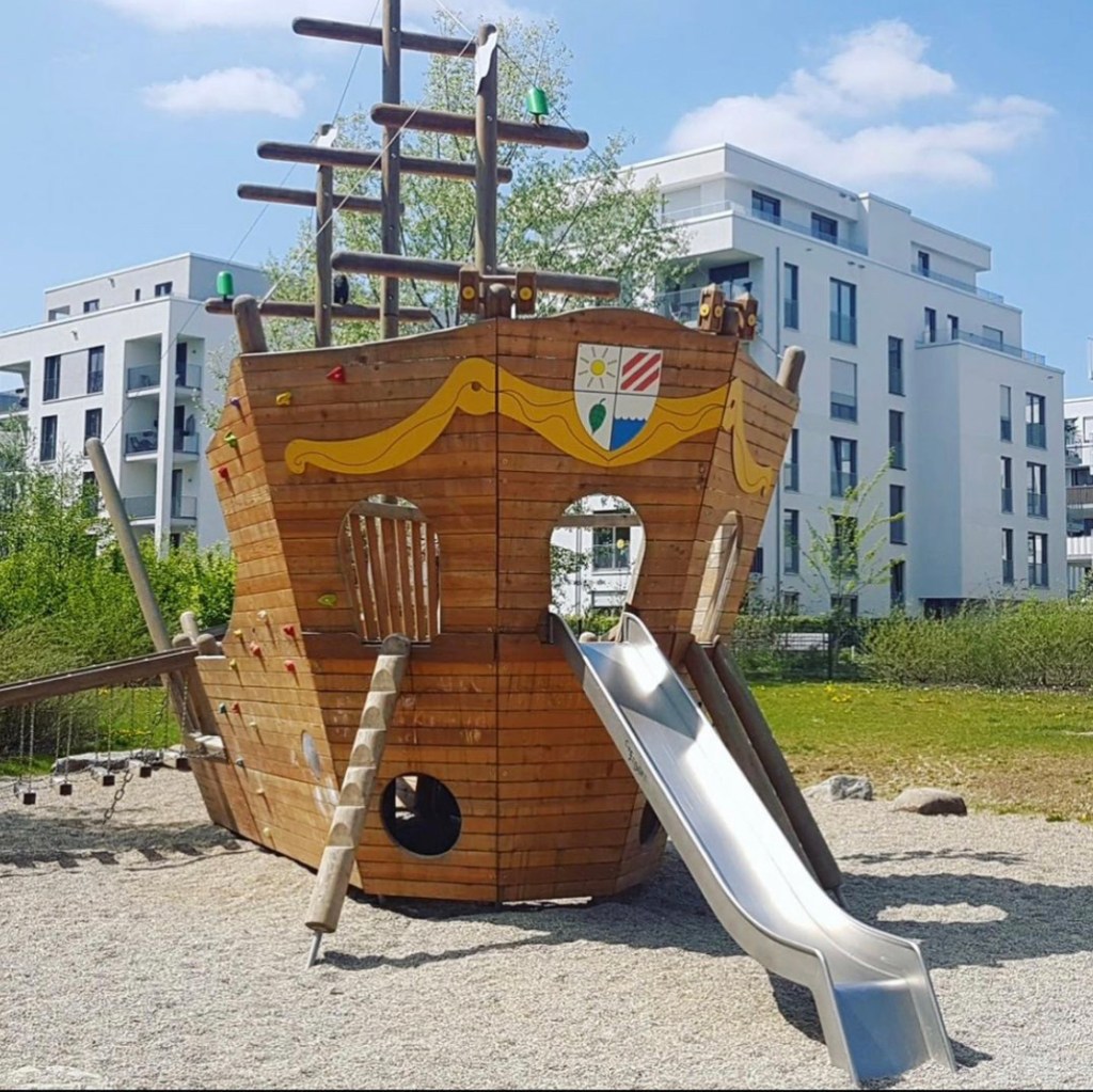 Секретная игровая площадка в виде большого корабля на самом берегу ручья Garchinger Mühlbach. Искать по адресу Waldweg 50 за мостиком.