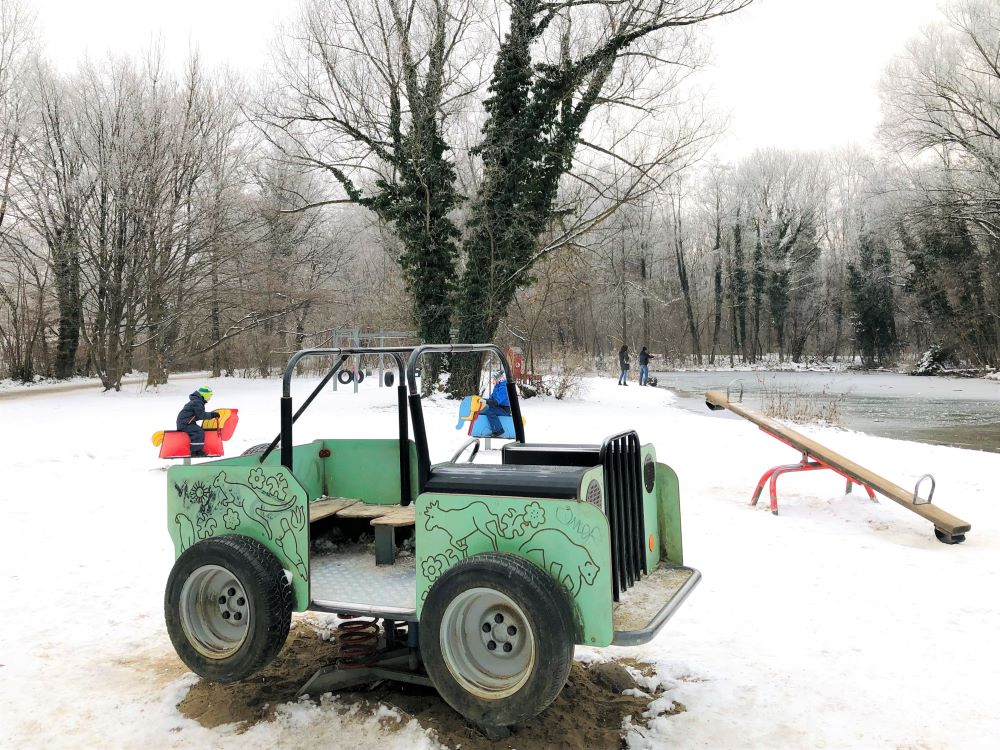 Мы оказываемся в Английском саду. Тут на выбор: налево пойдёшь — до дамбы дойдёшь, направо пойдёшь — в Aumeister попадёшь. Летом это популярный биргартен со своей детской площадкой. Мы же выбрали третье: залезть в бурелом и играть палками, ветками, рассматривать иней, представлять себя сказочными персонажами таинственного зимнего леса.