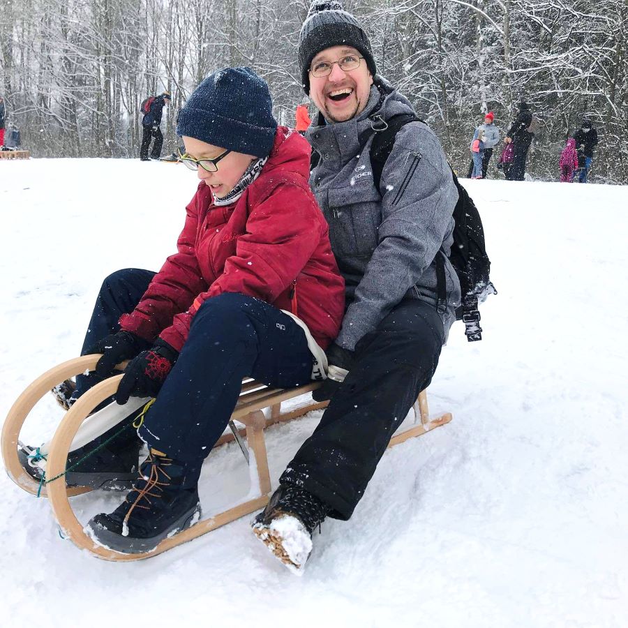 - Минут 10 идём по парку до основных горок, мимо прудов в сторону «Чертовой горы» (в гугле ищем Rodelhang Teufelsberg ). Горки видно издалека — не ошибётесь. Наслаждаемся скоростью, кочками и снегом в лицо. Тут уже нужны настоящие санки, тонкие ледянки не пойдут (мой копчик плачет).