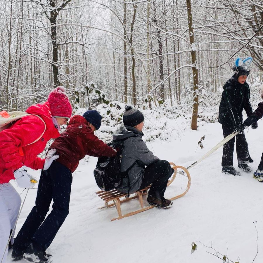 - Завершаем прогулкой по лесу. Идем в сторону Moossteig, далее по этой дорожке скатываемся на санках — там обычно совсем никого нет, поднимаемся обратно на Teufelsberg и снова на санках съезжаем к прудам по обычной дорожке. Дети к этому времени уже очень устают, и это сильно сокращает нам путь.