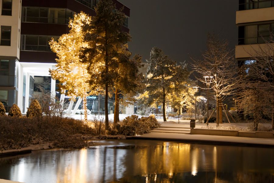 Снаружи он выглядит как бездушная коробка из бетона и стекла. Но внутри… Тут искусственное озеро с мостиком и террасами у воды, а вечерняя иллюминация создаёт ощущение праздника, которого так не хватило в декабре. Не меньше дюжины деревьев оплетены огоньками полностью, как и перила моста над озером.