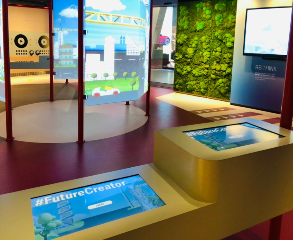 В автосалоне BMW Welt прошёл ремонт, и теперь тут ещё пафоснее. По салону бродит самоуправляемый робот, модный кинотеатр Future Forum показывает ролики о счастливом будущем вместе с BMW.