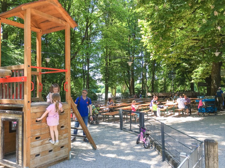 Большой биргартен на берегу озера, в самом сердце Английского сада. При нём есть прокат лодок и площадка.