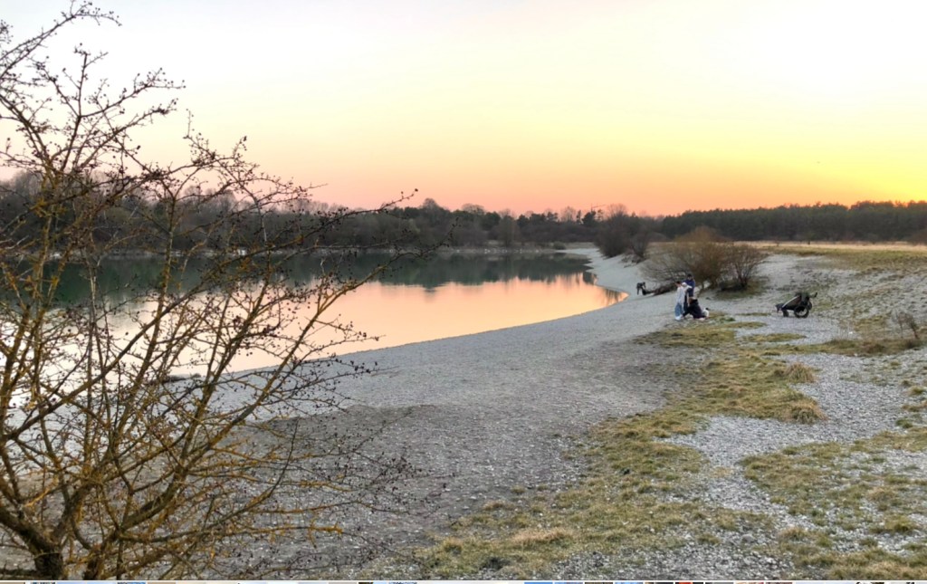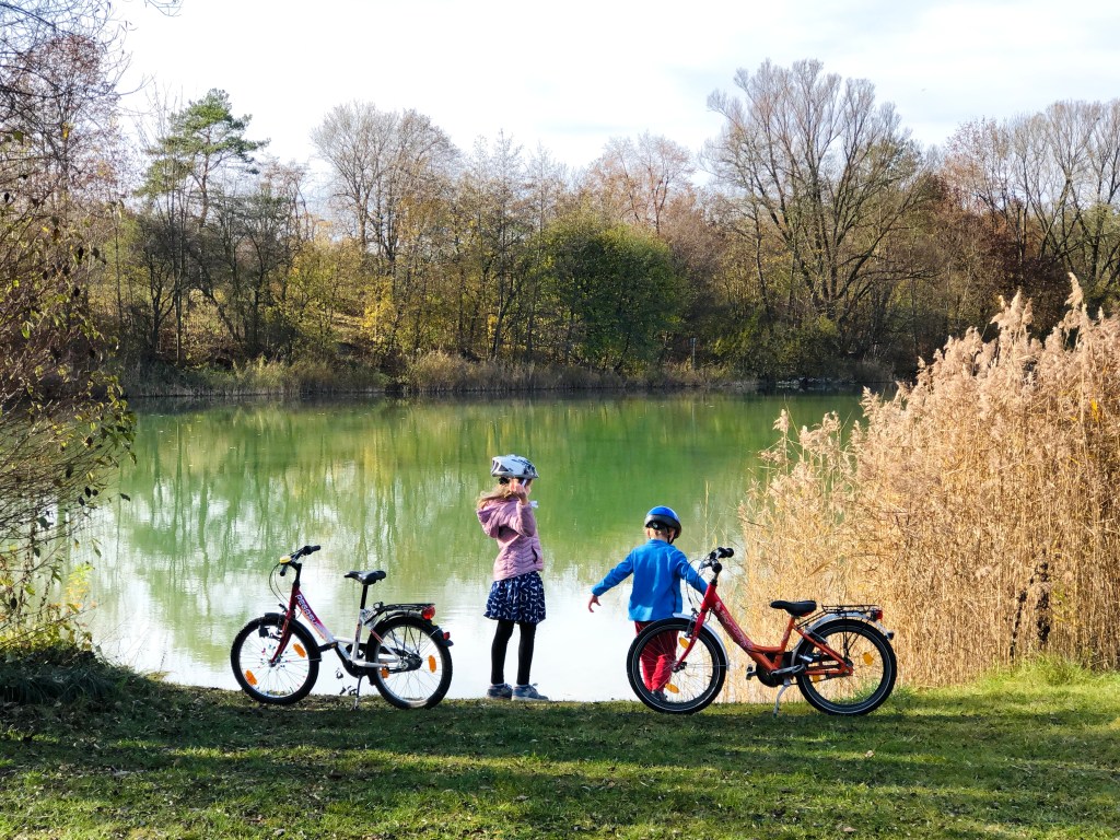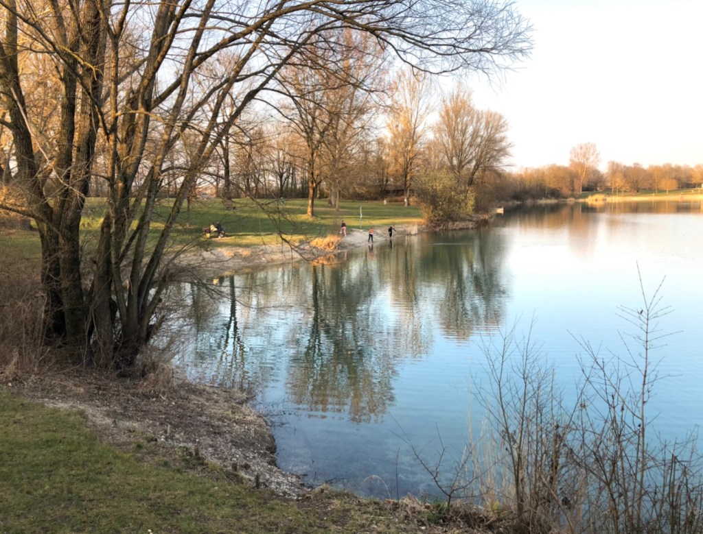 Проезжаем по мостику над трассой, и дальше по асфальтированной велодорожке через поля едем к озеру в Эхинге. Его берег располагает к медитативному отдыху, но мы ищем активностей!