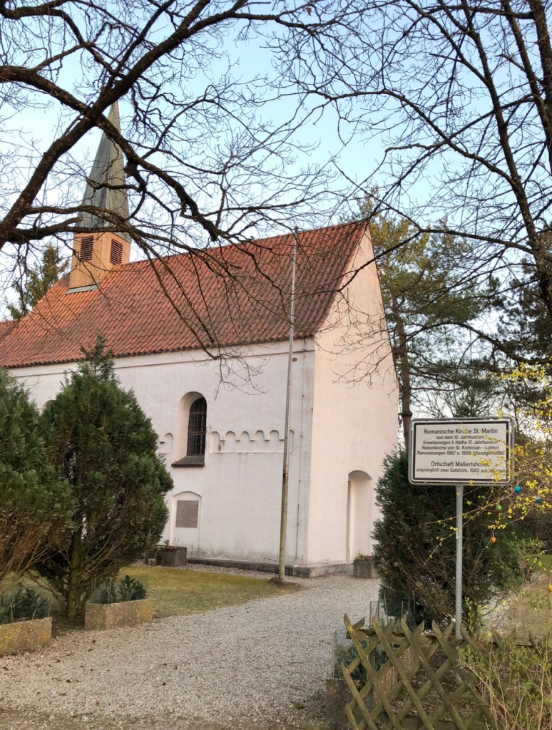 Наша цель — маленькая церковка Святого Мартина XII века, это всё, что осталось от поселения Mallertshofen. Сразу за церковью найдём пятое озеро, тут много собаководов, так как рядом школа для щенков.