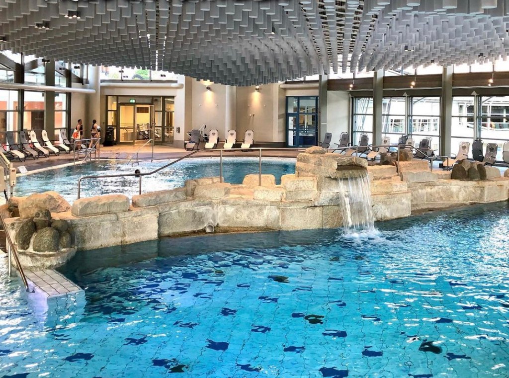 Двухэтажная зона с термальной водой из скважины. Дизайн помещений тут поинтереснее, чем в семейном бассейне. На верхнем этаже два бассейна с пузырьками, массажными струями, водопадом и даже баром в воде, вокруг которого течение. На нижнем этаже — бассейн в помещении, джакузи, две мокрых парилки и большой неглубокий бассейн на свежем воздухе.