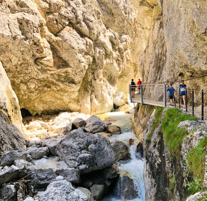 Огромные скалы, громыхающий в теснине ручей, крутые ступеньки и узкие коридоры, мостики над стремниной и водопад — Хёлленталькламм великолепен! Красота ущелья компенсирует и два часа в пробках, и долгий подъём по каменистой тропе.