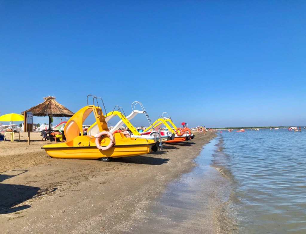 - Взять напрокат педальную лодку с горкой (15-20€ за час) и веселиться! Море мелкое, так что скатываться с горки и разрешать то же самое детям нестрашно.