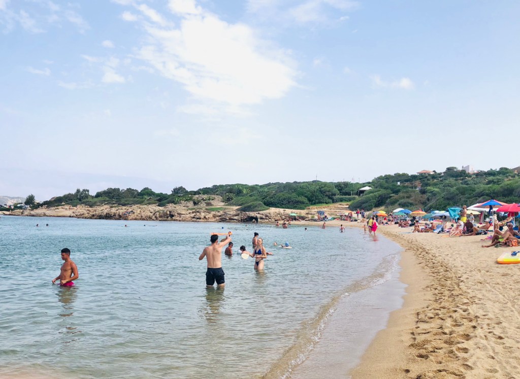 В южной части пляжа растут сосны, и именно тут нам больше всего понравилось. Среди сосен спрятан ресторан Shardana с собственной игровой площадкой и киоском с мороженым. Советую парковаться возле него и идти на пляж отсюда. А ещё это та редкая точка на острове, где есть бесплатный Wi-Fi.