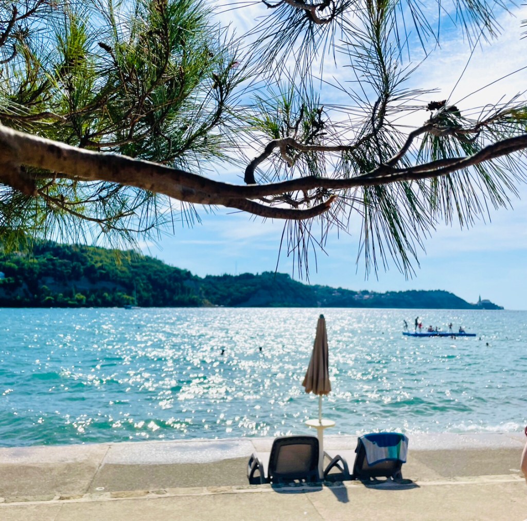 Мы были на пляжах в словенском Струньяне (Strunjan) — уютно и по-домашнему, а также в итальянском Триесте — многолюдно, рядом с центром красивого города.