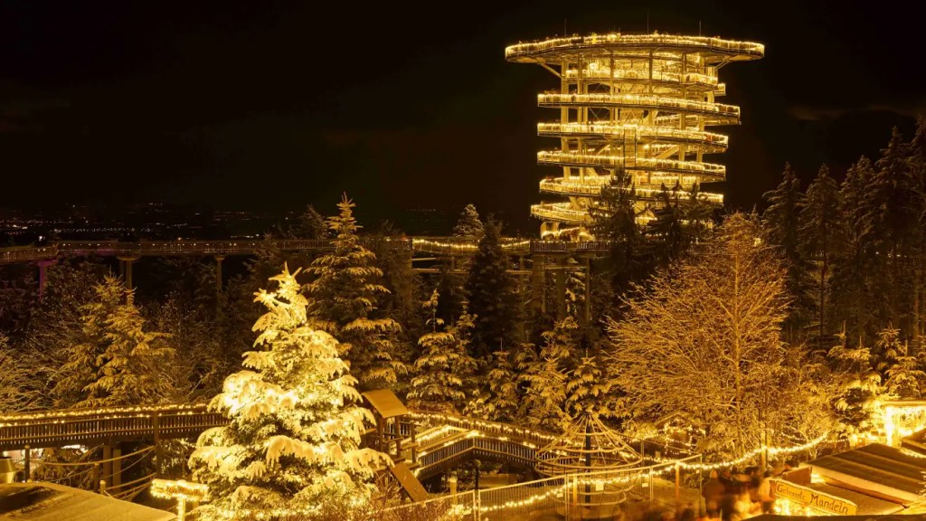 Возле моста над кронами деревьев в Баварском лесу праздничная ярмарка с яркой иллюминацией. Подсвечена башня над кронами, перевёрнутый вверх тормашками домик, есть плаващий вертеп и особая атмосфера зимнего горного леса.
