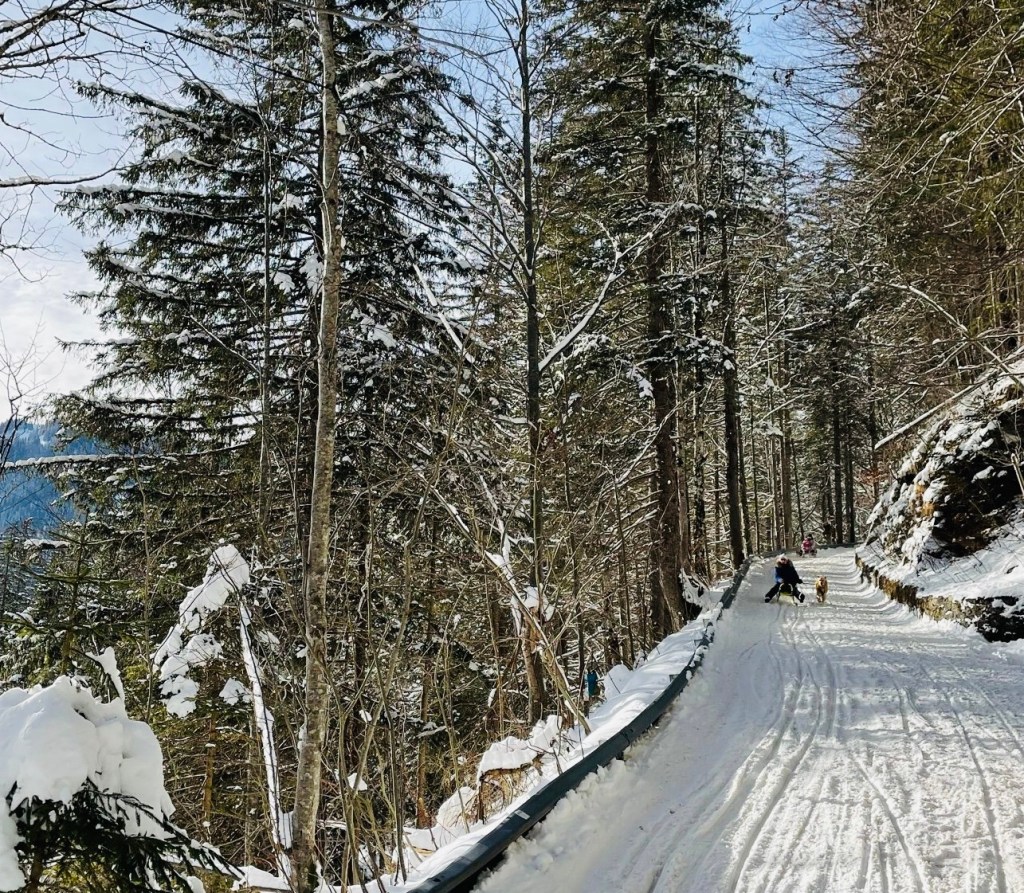 Я рекомендую не пользоваться подъёмником, а пойти на красивый и несложный зимний хайк через ущелье Партнахкламм (Partnachklamm) и далее по указателям на Kaiserschmarrnalm и далее на Eckbauer — так вы нагуляетесь по очень живописной местности и окажетесь на верхней станции того же самого подъёмника. Прокат санок есть и на верхней станции тоже.
