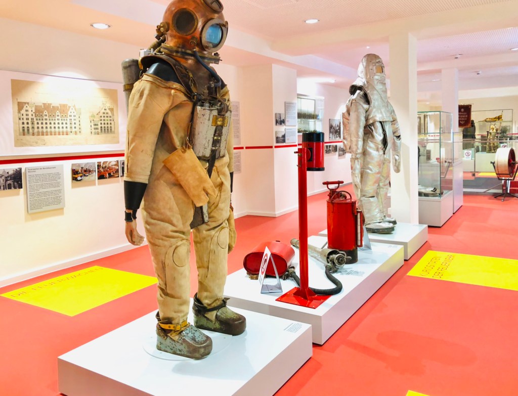 На верхнем — история пожарных в Мюнхене в картинках и текстах, там рекомендуют начинать осмотр. Защитные костюмы прошлого века шокируют, идти в таких в пекло могли только настоящие герои.