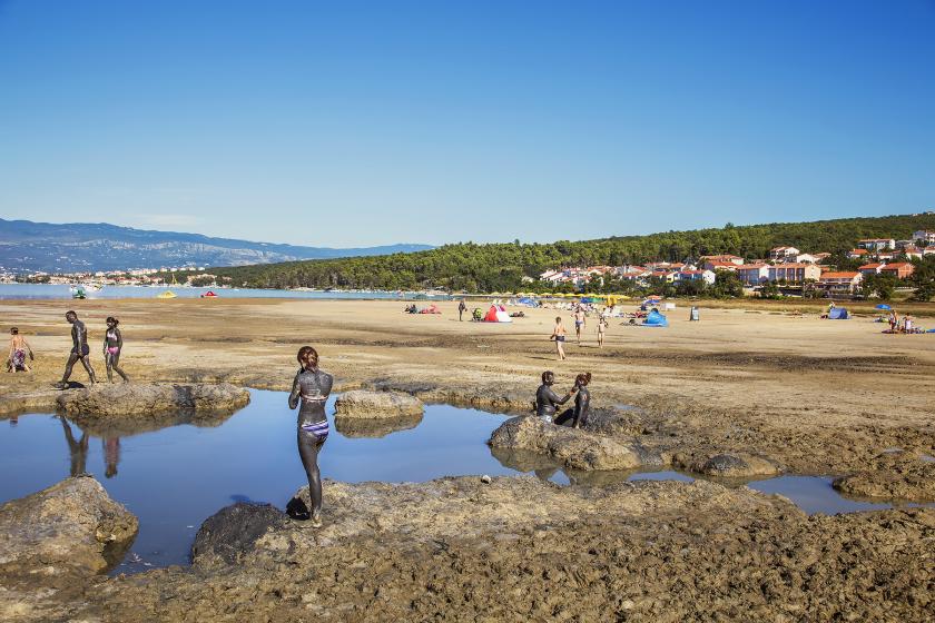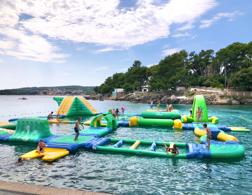 Пройдите вдоль склистого берега дальше, и окажетесь в бухте Дражица (Plaža Dražica). Там спрятан аквапарк — надувные батуты на воде, которые очень нравятся детям. Там же есть прокат педальных лодок с горкой, каяков и SUP’ов.