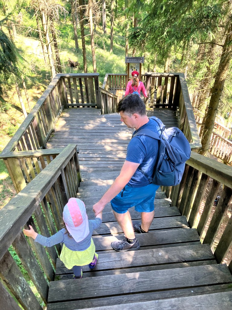 На мосту есть препятствия, которые нужно преодолеть: шатающиеся балки, кольца. Коляску лучше не брать — с ней придётся идти лесной тропой и пропустить всю красоту. Малышам берите переноску.