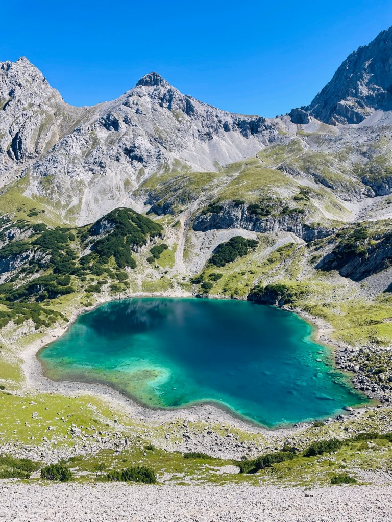 Нижe хижины в долинке — бирюзовое озеро Драхензее, где приятно прогуляться вдоль воды, полюбоваться видами. От озера справа или слева можно подняться чуть повыше, чтобы посмотреть на него с высоты.