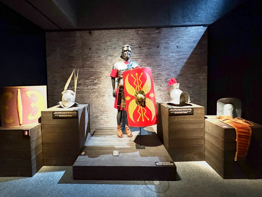 Тут множество интерактивных экранов: карта Римской империи в движении, устройство Колизея, снаряжение бойцов. Есть игровые станции, где можно примерить римский шлем или «нарядить» воина перед боем. Несколько видеоэкранов. И много реальных археологических экспонатов, причём не только из Италии, но и с баварского Ретийского Лимеса.